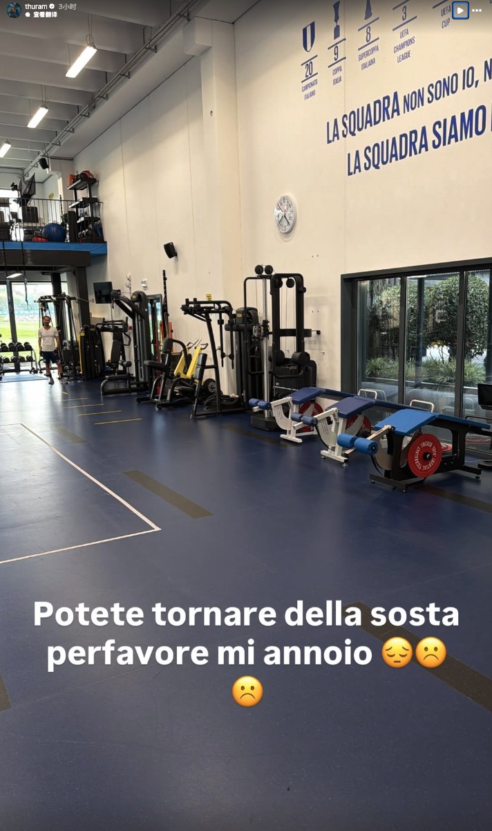 10月13日,国米前锋马库斯-图拉姆在社交媒体发布一张健身房照片,并附文:“期待队友早日归队,当前状态较为空闲”